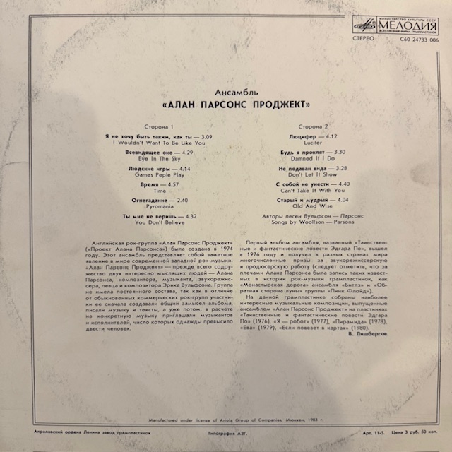 Виниловая пластинка Алан Парсонс Проджект (Мелодия) LP