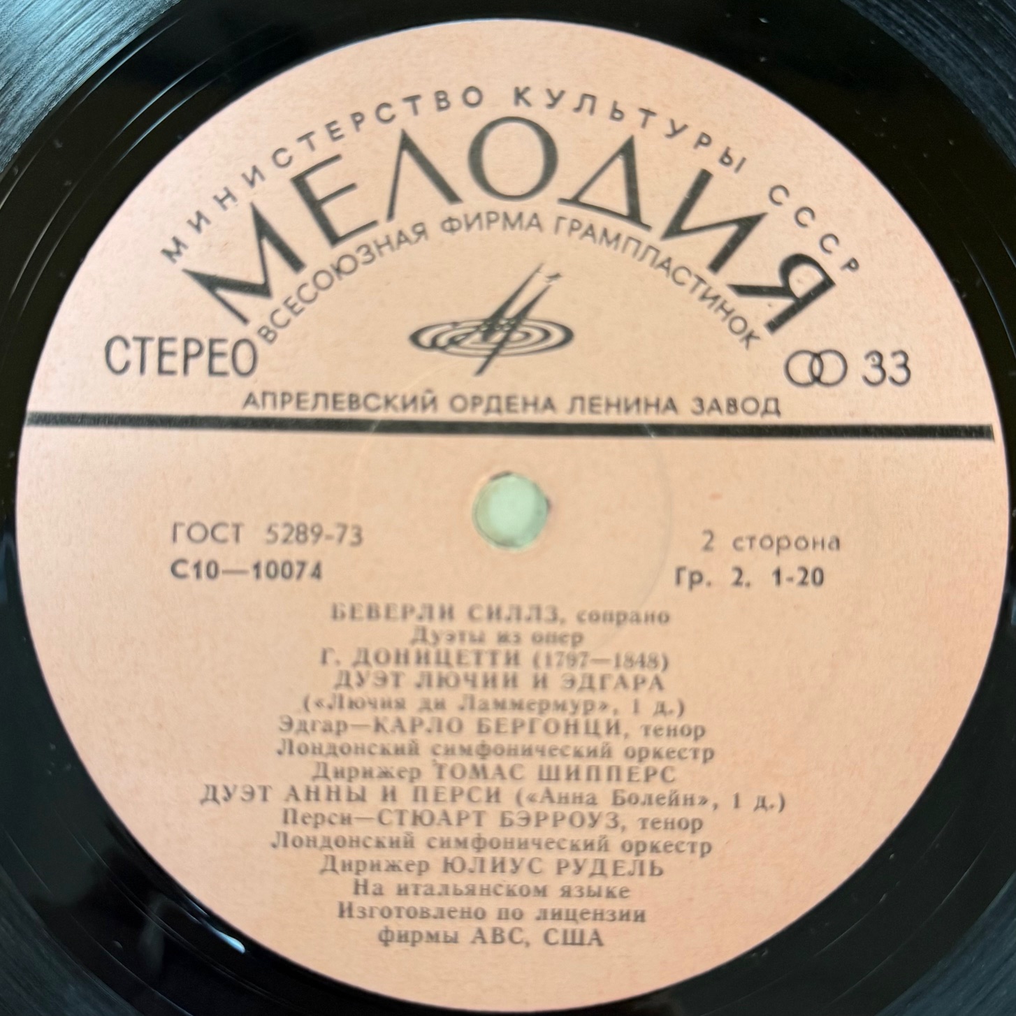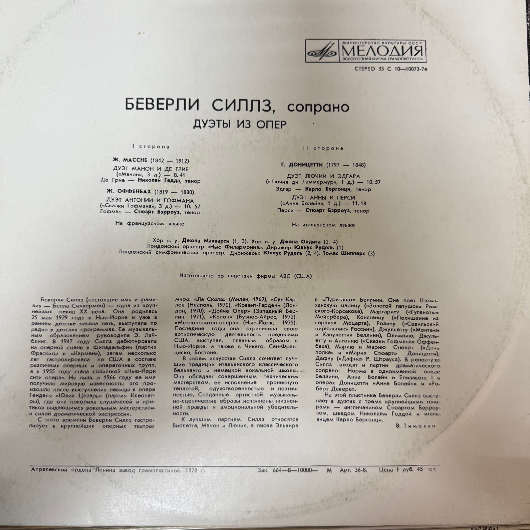 Виниловая пластинка Беверли Силлз, Николай Гедда, Стюарт Берроуз, Карло Бергонци (Мелодия) LP
