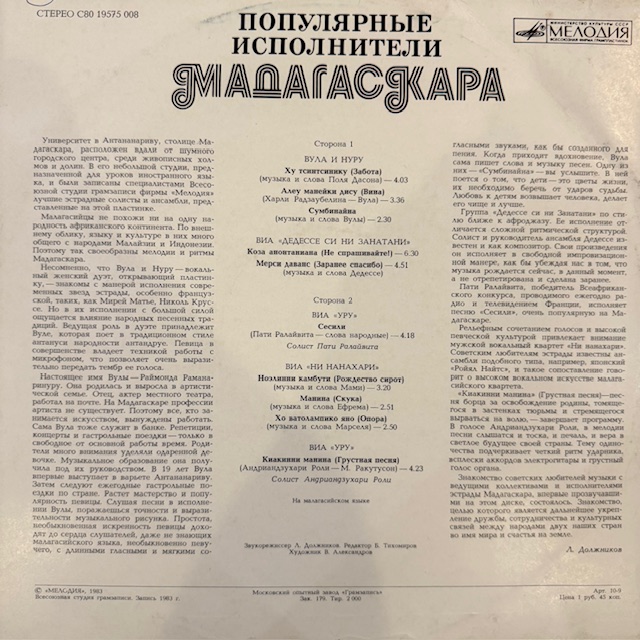 Виниловая пластинка Сборник - Популярные исполнители Мадагаскара(Мелодия) LP
