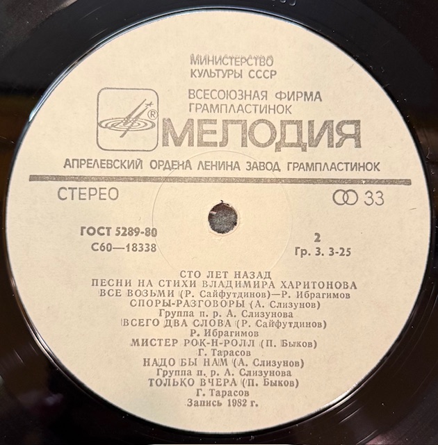 Виниловая пластинка Владимир Харитонов – Сто Лет Назад. Песни На Стихи Владимира Харитонова (Мелодия) LP
